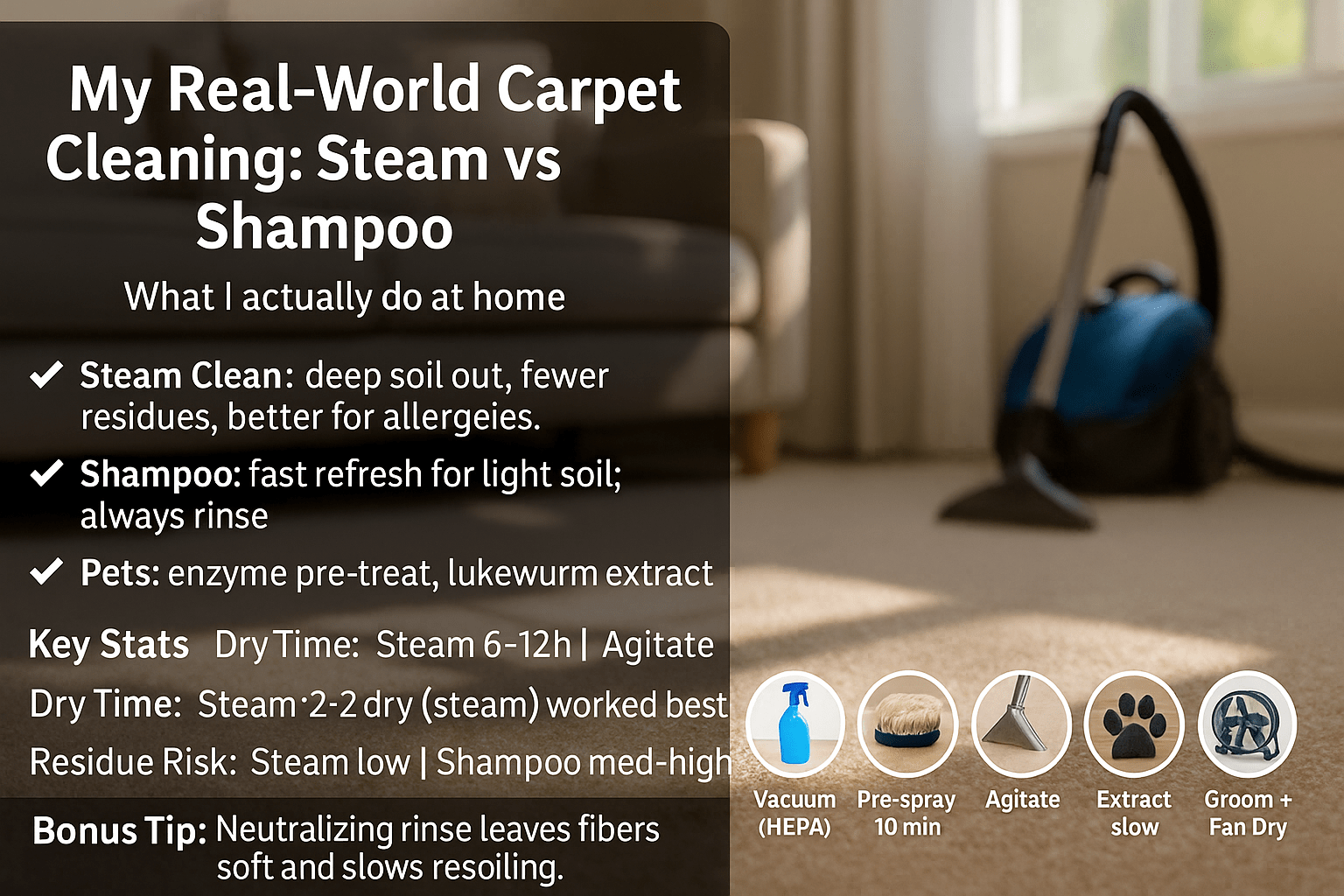 Most days, I steam clean first because heat plus extraction pulls out the gritty stuff that makes carpet look tired again in a week. When I need a quick cosmetic refresh—like before guests—I’ll shampoo, then follow with a fresh-water rinse so the fibers don’t hold sticky residue and re-soil fast.