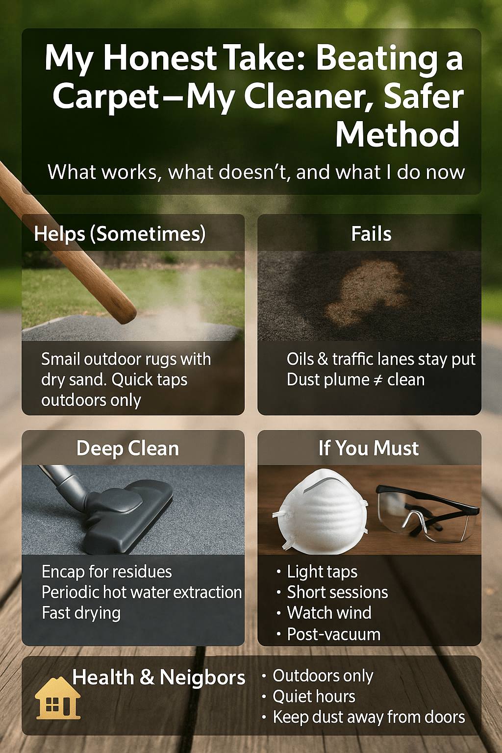 I use beating rarely, only for small, very dusty rugs, and only outdoors with light taps. My main routine is HEPA pre-vac, smart agitation, the right chemistry when needed, and fast drying. I pick outcomes over drama and neighbors over noise.