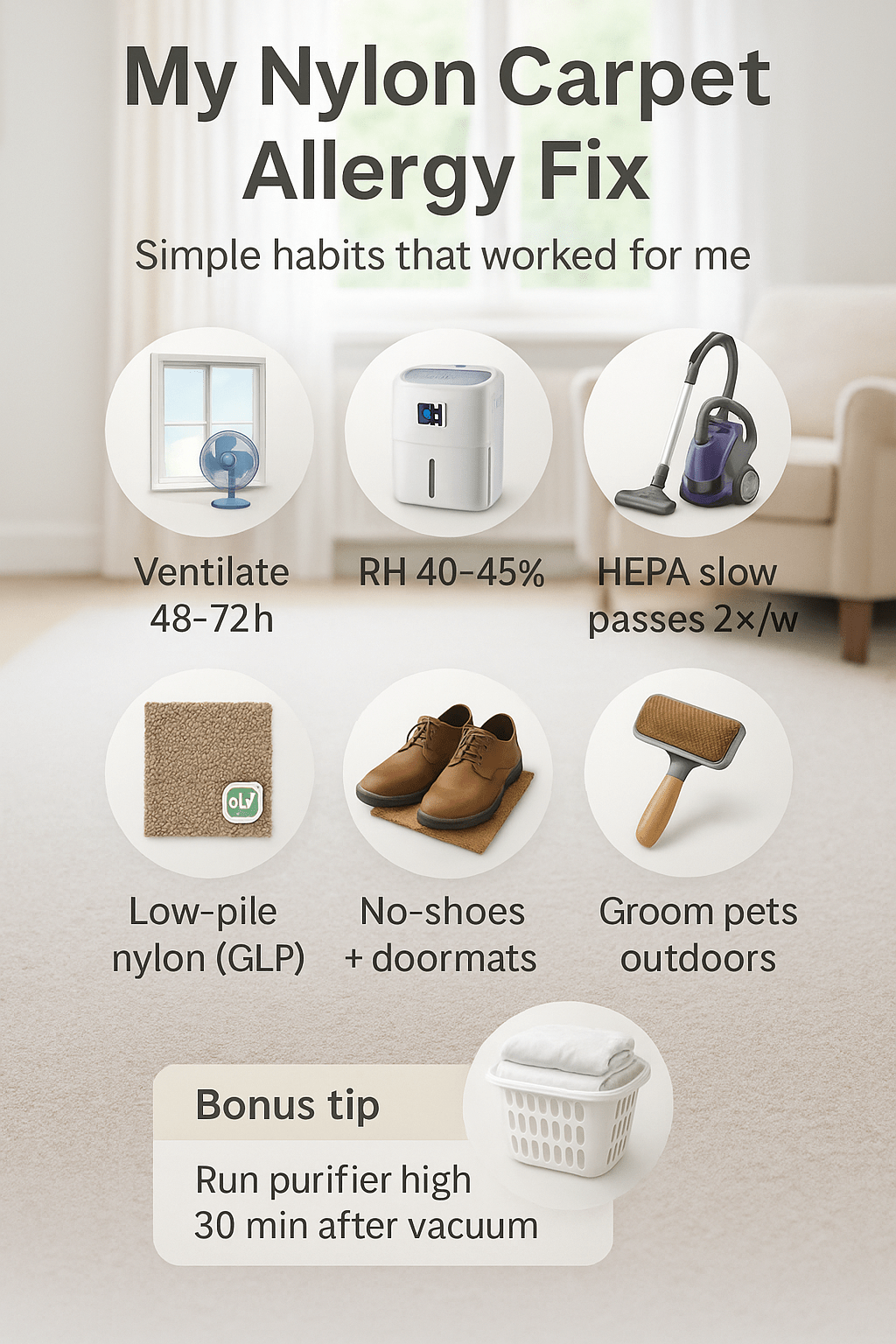 I suspected the nylon because it was the one constant under my feet. Still, the timing didn’t scream “fiber allergy.” It felt more like something inside the pile was getting stirred up. I decided to test the space like a mini lab: control humidity, change cleaning tools, and track symptoms daily.