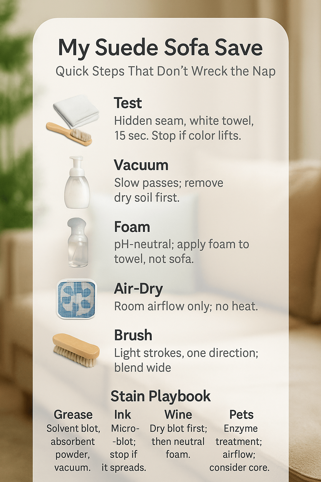My best results come from what I do before any liquid touches suede. I put pets in another room, crack a window, switch on a fan, and lay out white towels. Then I vacuum slowly with the upholstery tool to remove dry soil so I don’t create muddy paste later.