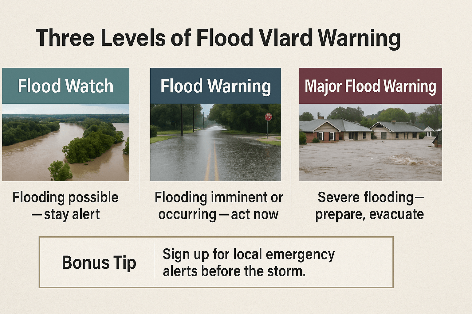 Flood warnings are issued in three levels, and each one serves a specific purpose. Flood Watch means conditions are favorable for flooding. Flood Warning indicates that flooding is imminent or already occurring. Major Flood Warning signifies severe flooding with significant threats to life and property.