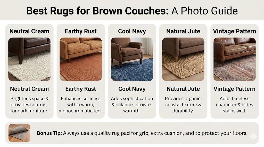Finding the right rug to pair with a brown sofa transforms a living room from dated to designer. Neutral cream rugs brighten the space, while textured jute materials add organic warmth. For a bold look, navy or emerald patterns provide a sophisticated contrast to leather or fabric upholstery.