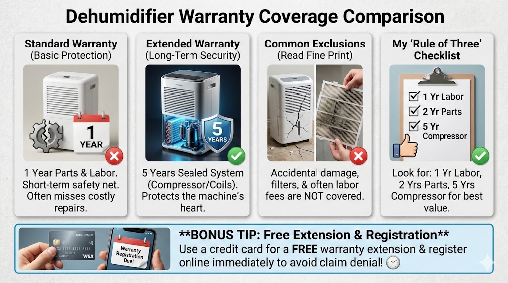When I’m looking for a new dehumidifier today, I follow a strict “Rule of Three.” I want to see at least one year of labor coverage, two years of parts coverage, and five years on the compressor. If a brand can’t meet those basic requirements, I usually keep looking until I find a manufacturer that stands by their work.
