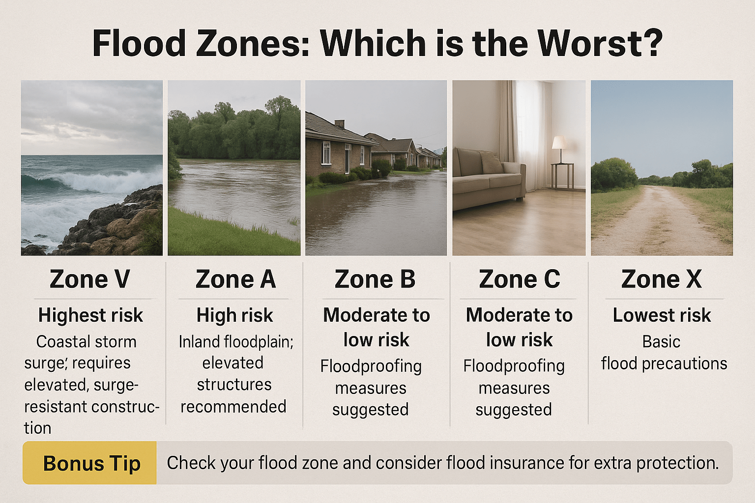 | Zone V | Highest risk | Building considerations for storm surges | Mandatory for federally backed loans |