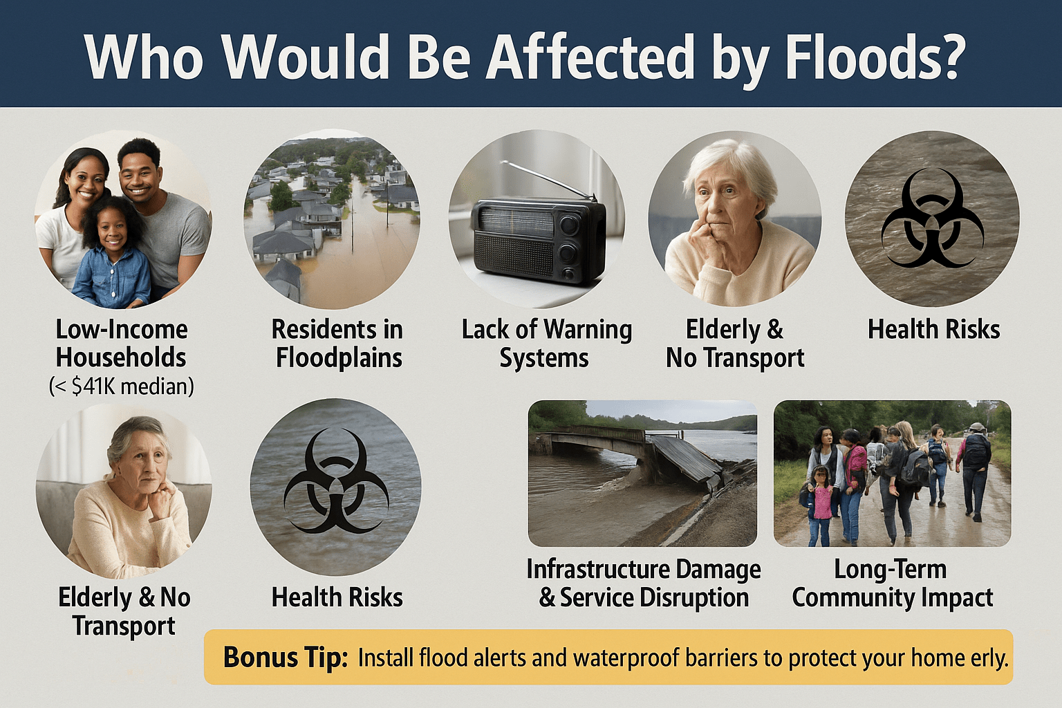 Community Economic Strain Communities with median household incomes below $41,000 are at a higher risk. Floods can devastate these areas, leading to long recovery periods.