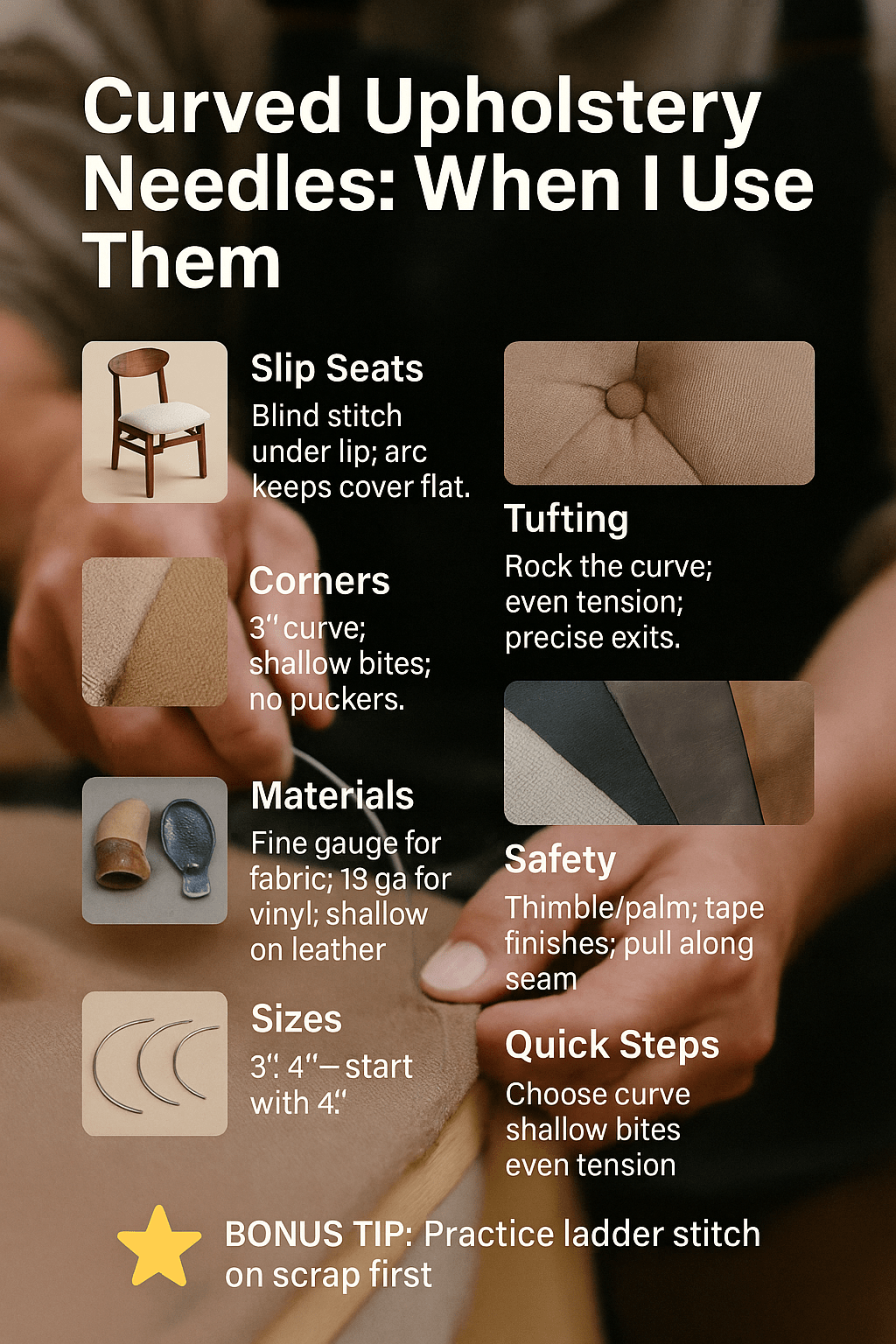 My early dining chair fixes looked neat on the bench, then turned messy along the inside rail. A straight needle pushed fabric off-grain, and I’d re-sew the same inch three times. The first day I tried a curved needle, I stitched from above the frame and the seam behaved.