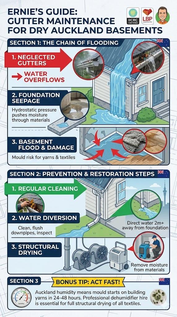 Preventing basement flooding in Auckland starts with clear gutters. Blockages force water down foundations, causing internal seepage. Maintaining drainage systems protects your flooring materials from water damage. Professional flood restoration often begins with addressing these simple exterior maintenance failures before they escalate into costly structural repairs.