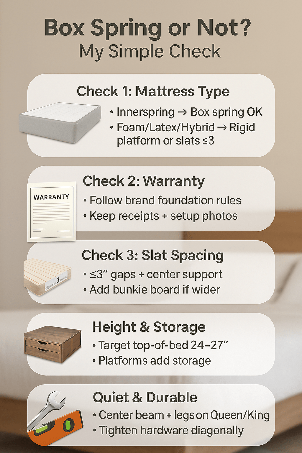 I start with type: innerspring → box spring or springy foundation can help bounce. Foam/latex/hybrid → rigid platform or slats ≤3″. Next, warranty: I match exactly what the brand demands. Finally, height: if I need a taller bed, I add a low-profile box or bunkie board, not guesswork.