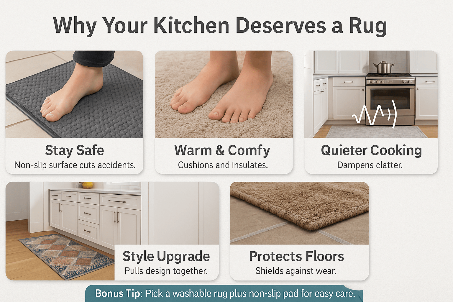 Why rug in kitchen is essential: it boosts safety, adds warmth, and improves aesthetic appeal. A non-slip kitchen rug prevents accidents, while a durable rug material can protect floors from scratches. This functional addition also reduces noise, making cooking tasks more comfortable.