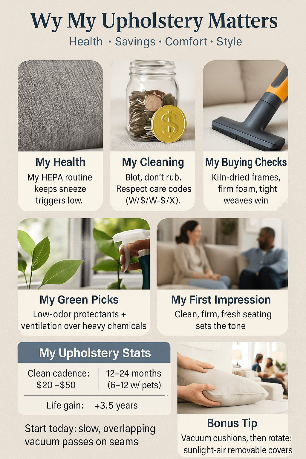 Upholstery isn’t just cushions; it’s a daily health, money, and comfort decision. Buy the bones, read the labels, vacuum the seams, blot the spills, and schedule the resets. If you do one thing today, give your sofa a slow, thorough pass and set a reminder for the next one.