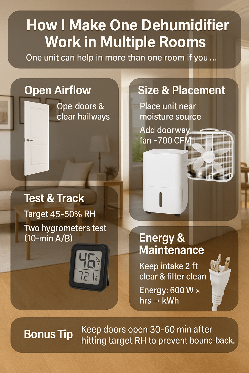 My first win came from propping doors open and pointing a basic box fan at the doorway of the damp room. That fan didn’t “blow dry air” everywhere; it stirred and mixed the humid and drier air so the unit could keep processing new air. The change in adjacent rooms was noticeable in an hour.