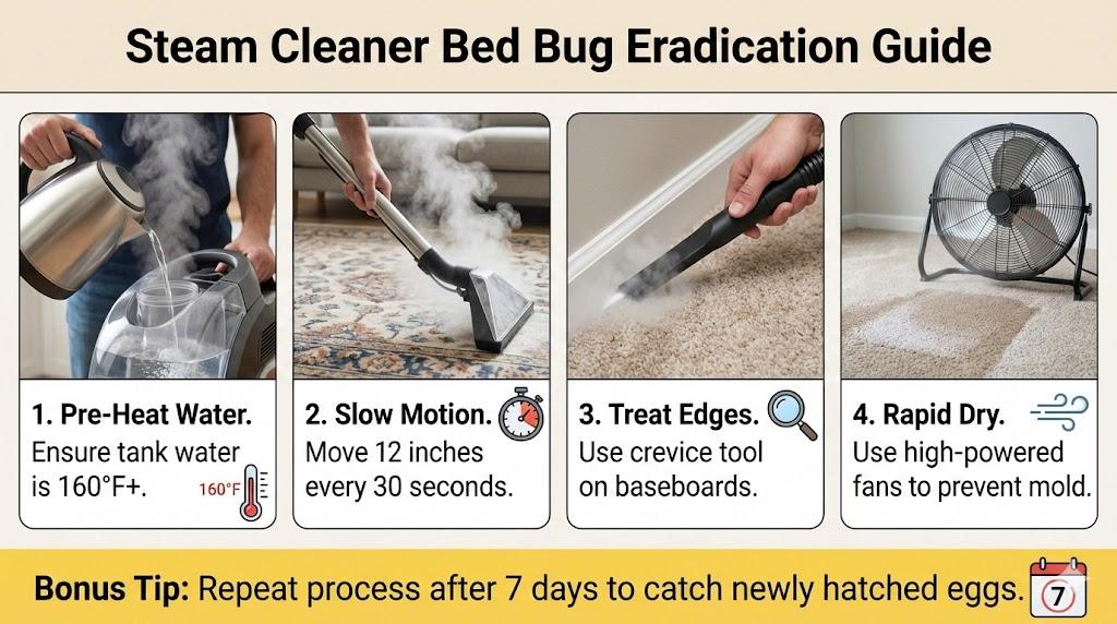 I discovered that high-pressure steam is a game-changer. By maintaining a nozzle temperature above 160°F, I successfully neutralized resistant bed bug strains hiding in the pile. Using a systematic cleaning approach ensures that no eggs survive to hatch later and restart the life cycle.