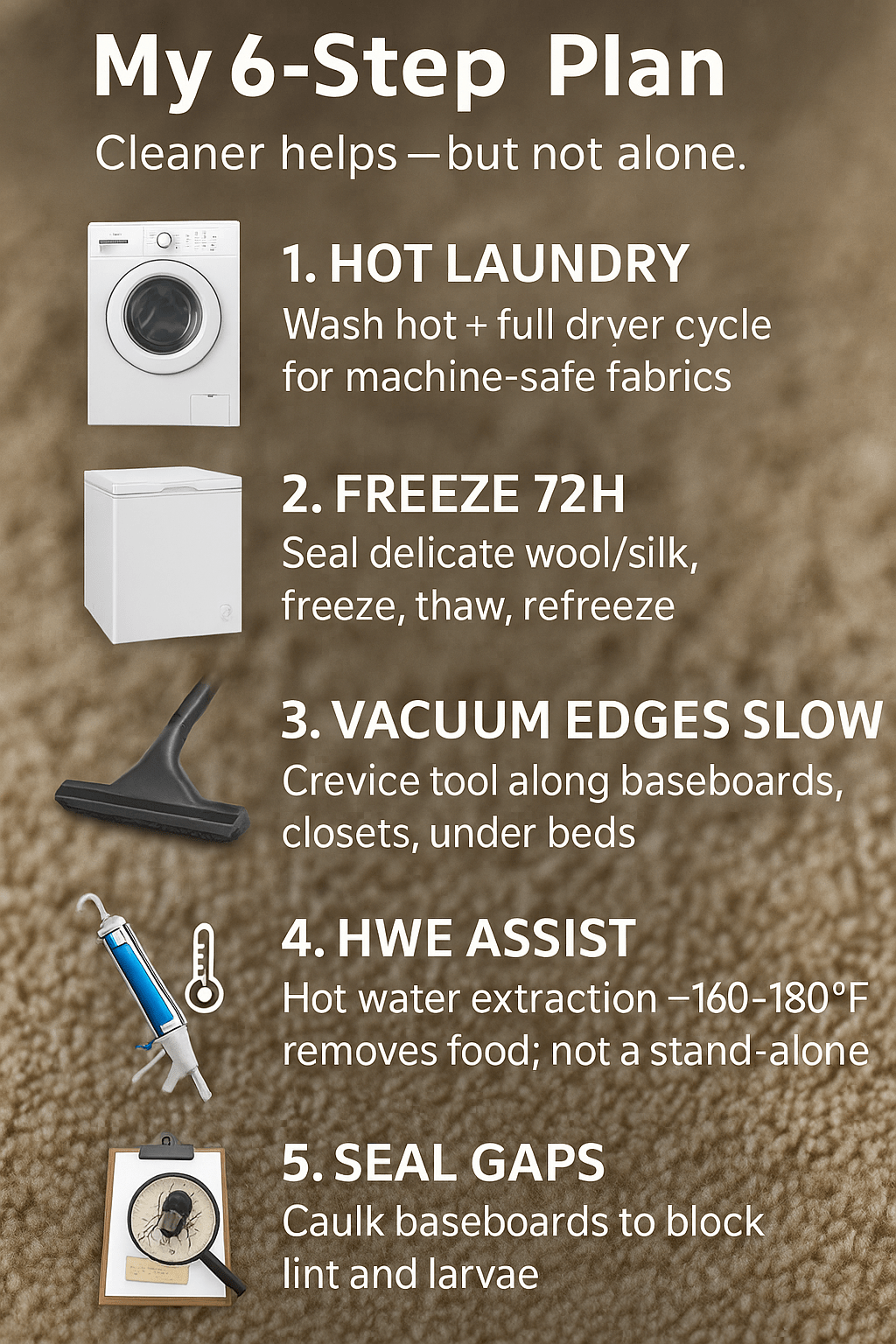 I audited textiles. Anything machine-safe went hot washer + dryer; dry-clean-only pieces went bagged for the cleaner; delicate heirlooms got sealed and frozen in cycles. That’s when fresh damage stopped. My mistake had been treating carpets while ignoring the mobile buffet living on fabrics.