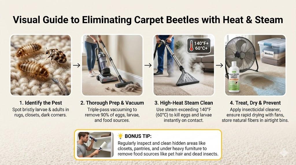 Does a carpet cleaner kill carpet beetles? High-temperature steam units effectively destroy eggs and larvae on contact. To ensure success, ensure water exceeds 140°F while using insecticidal shampoos and frequent vacuuming to eliminate food sources and prevent future infestations in home textiles.
