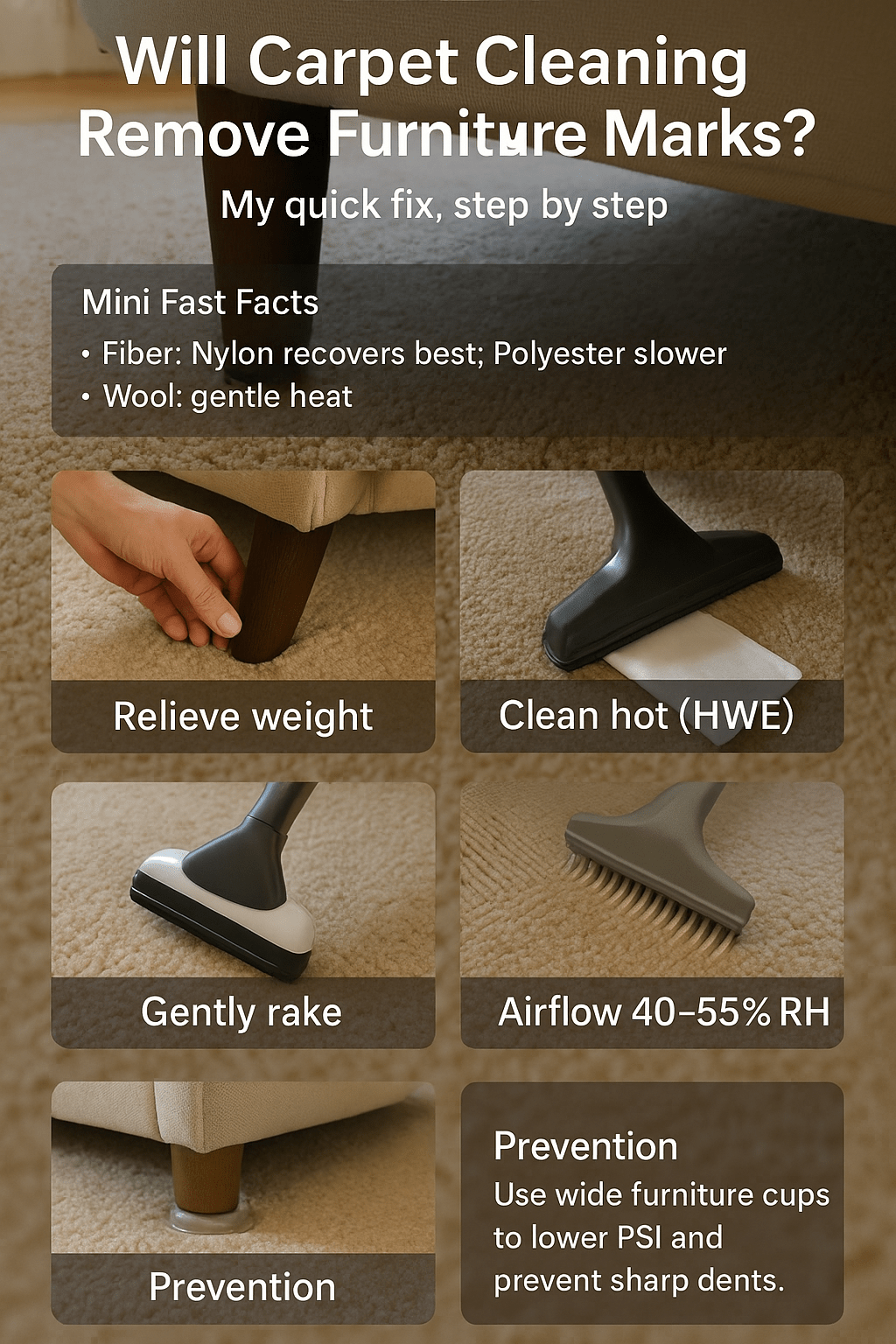 Carpets like 40–55% relative humidity. Too dry and fibers get stubborn; too wet and they stay limp. I set HVAC to hold steady conditions and run a fan in rooms with big sectionals. A little airflow and stable RH save me from future dent-lifting appointments.