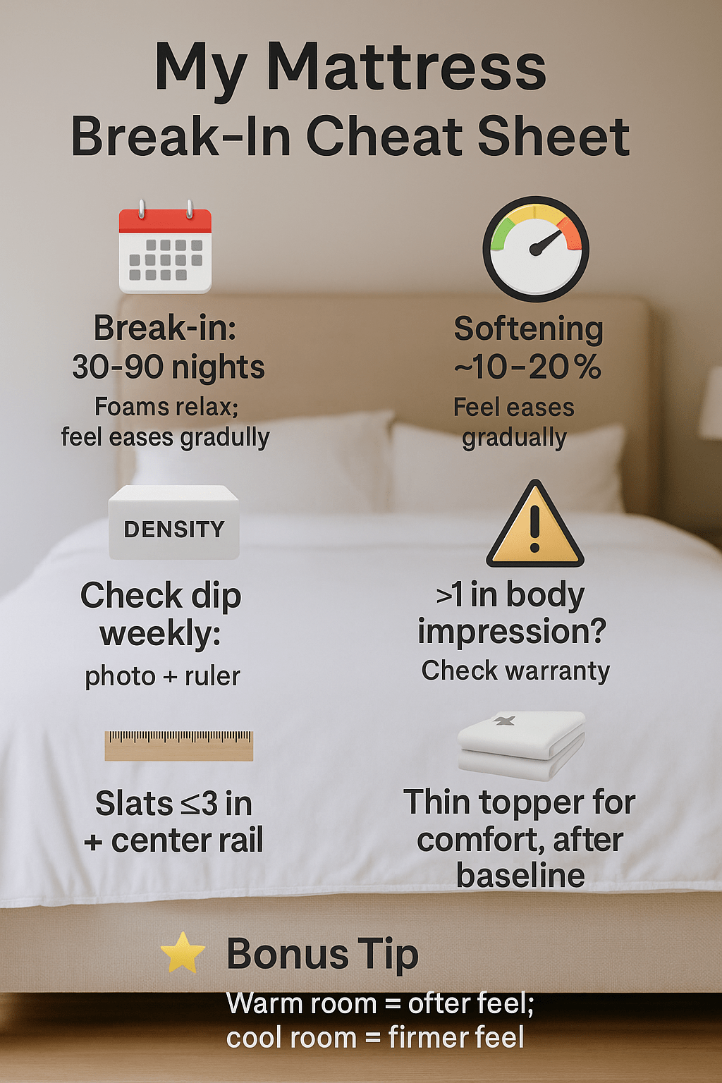 Most beds mellow meaningfully by weeks 3–6 and stabilize by weeks 8–12. Materials, room temperature, and your body weight set the pace. Don’t judge on night two—give it calendar time and track with simple measurements so you can tell change from bias.